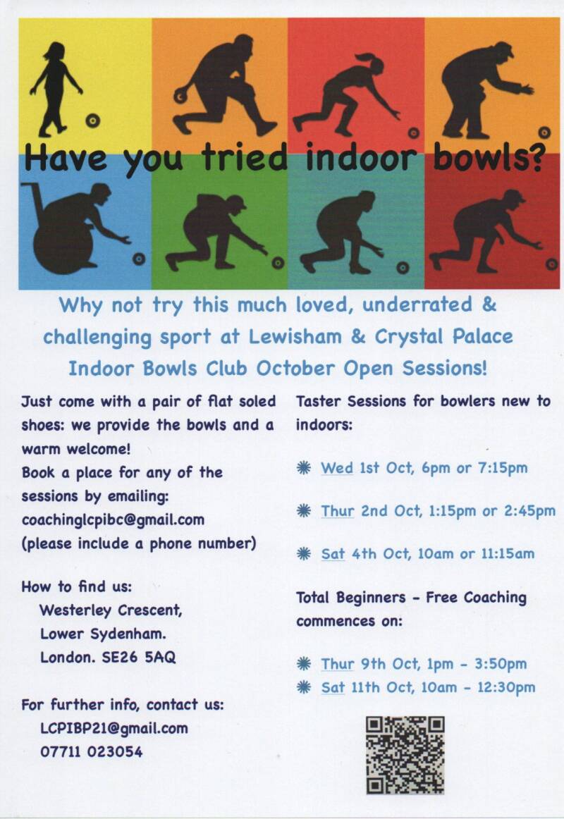 Our Open Days for total beginners to bowls will be on Thursday 9 October from 1.00 to 3.50pm and Saturday 11 October 10.00am to 12.30pm. Outdoor bowlers who are new to indoor bowls may attend on Wednesday 1 October 6.00pm OR 7.15pm, Thursday 2 October 1.15pm OR 2.45pm and Saturday 4 October 10.00am OR 11.15am. - please note all the above sessions need to be booked. For existing members, and new members who have bowled indoors before, there will be Opening Drives on Saturday 4 October and Sunday 5 October at 2.00pm.